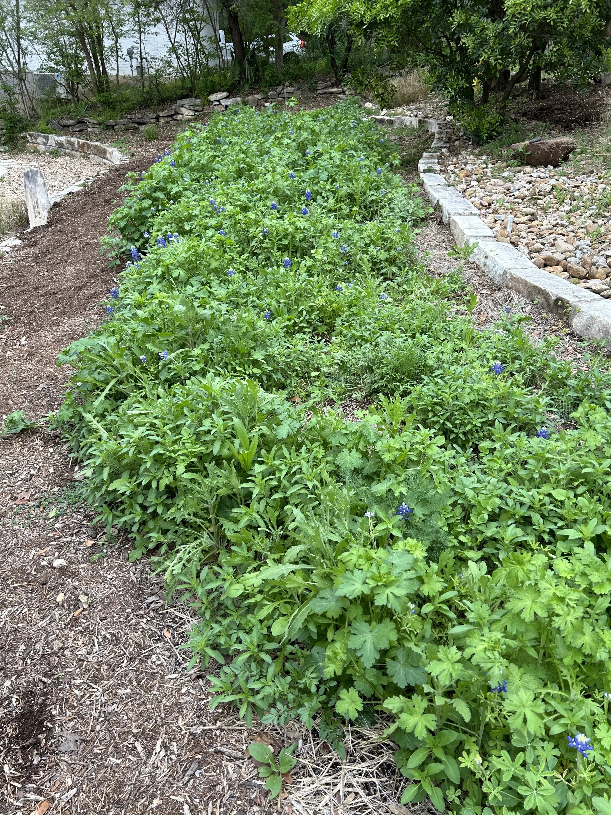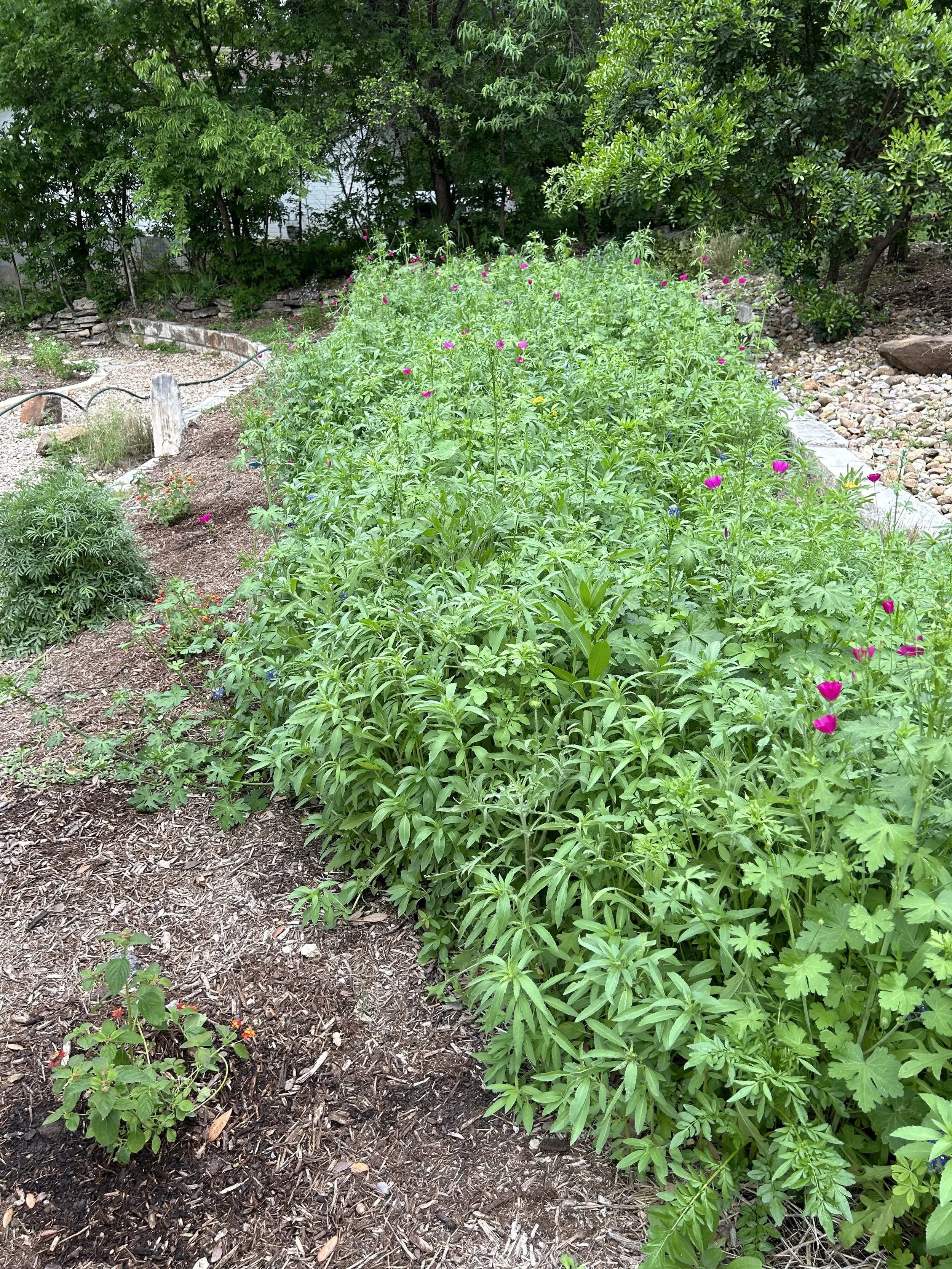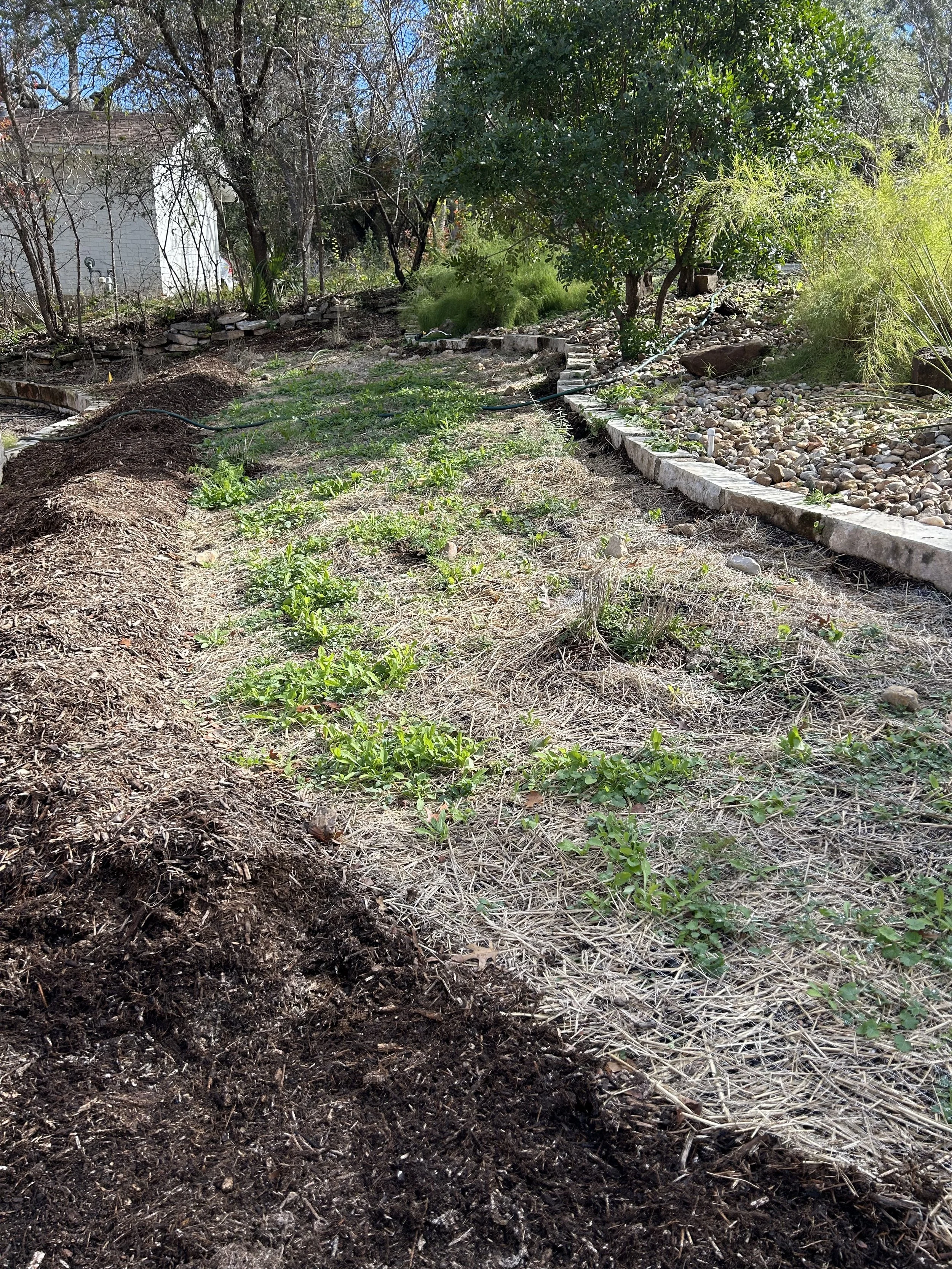 Removed all mulch from the planting area and added a 1/4” dusting of decomposed granite. Wildflower seeds seem to germinate better in DG.