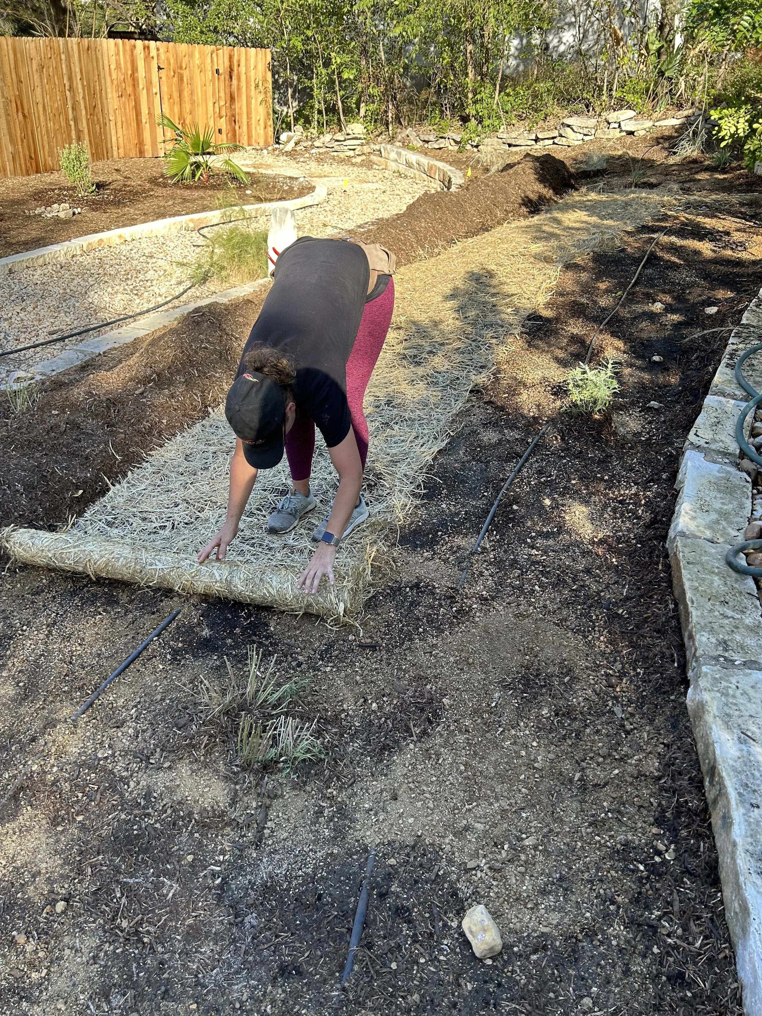 Installed a straw erosion-control blanket to prevent the seeds from washing down the slope. Here, we made the mistake of buying a product from Home Depot, which included what was advertised as a “photodegradable” netting but was actually just plastic. Two years in the Texas sun has done nothing to degrade this plastic crap, and we’re still pulling it out. A better alternative would have been Native American Seed’s Wood Fiber Erosion Control Blanket, which is fully biodegradable and doesn’t include plastic.