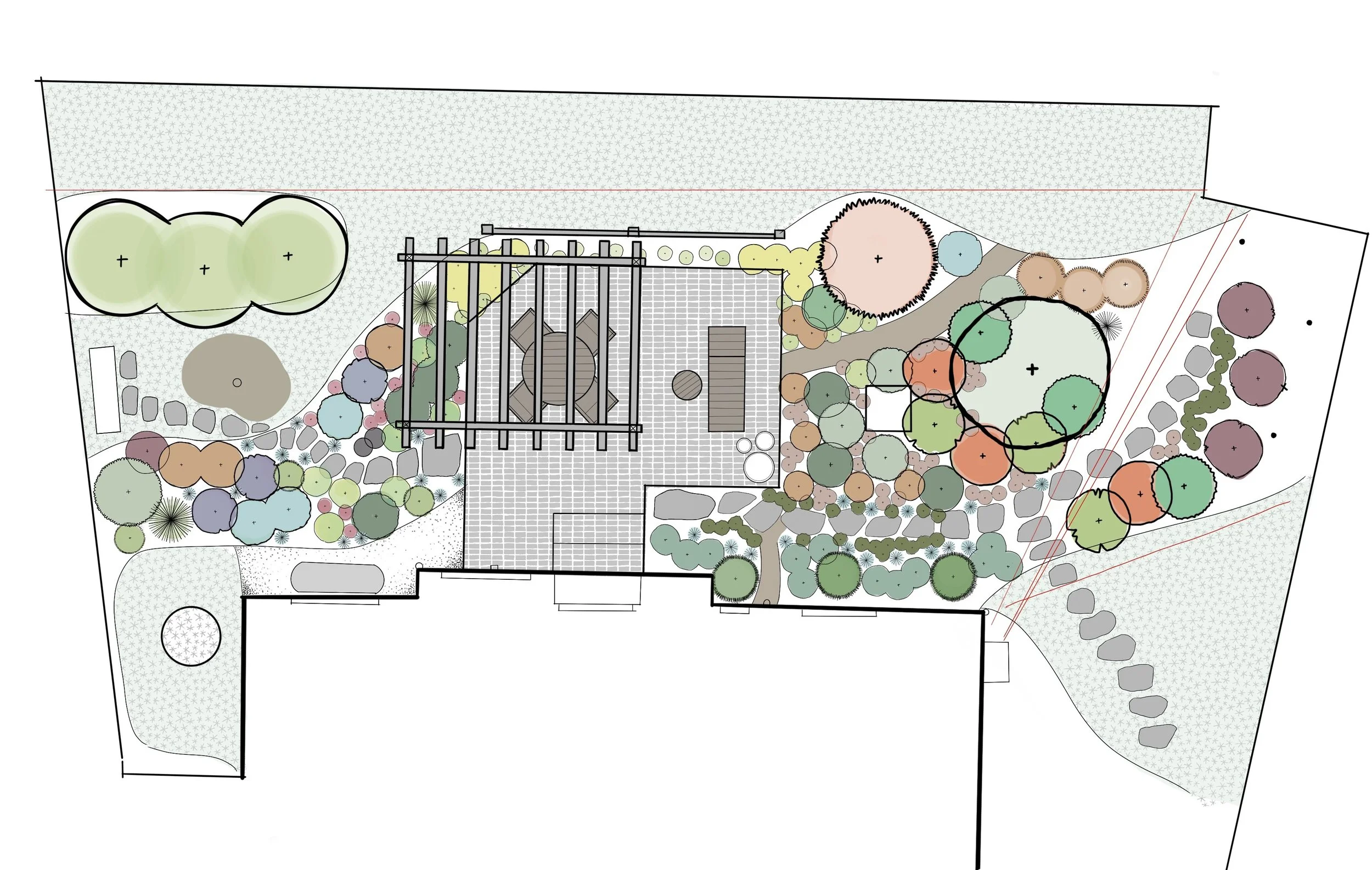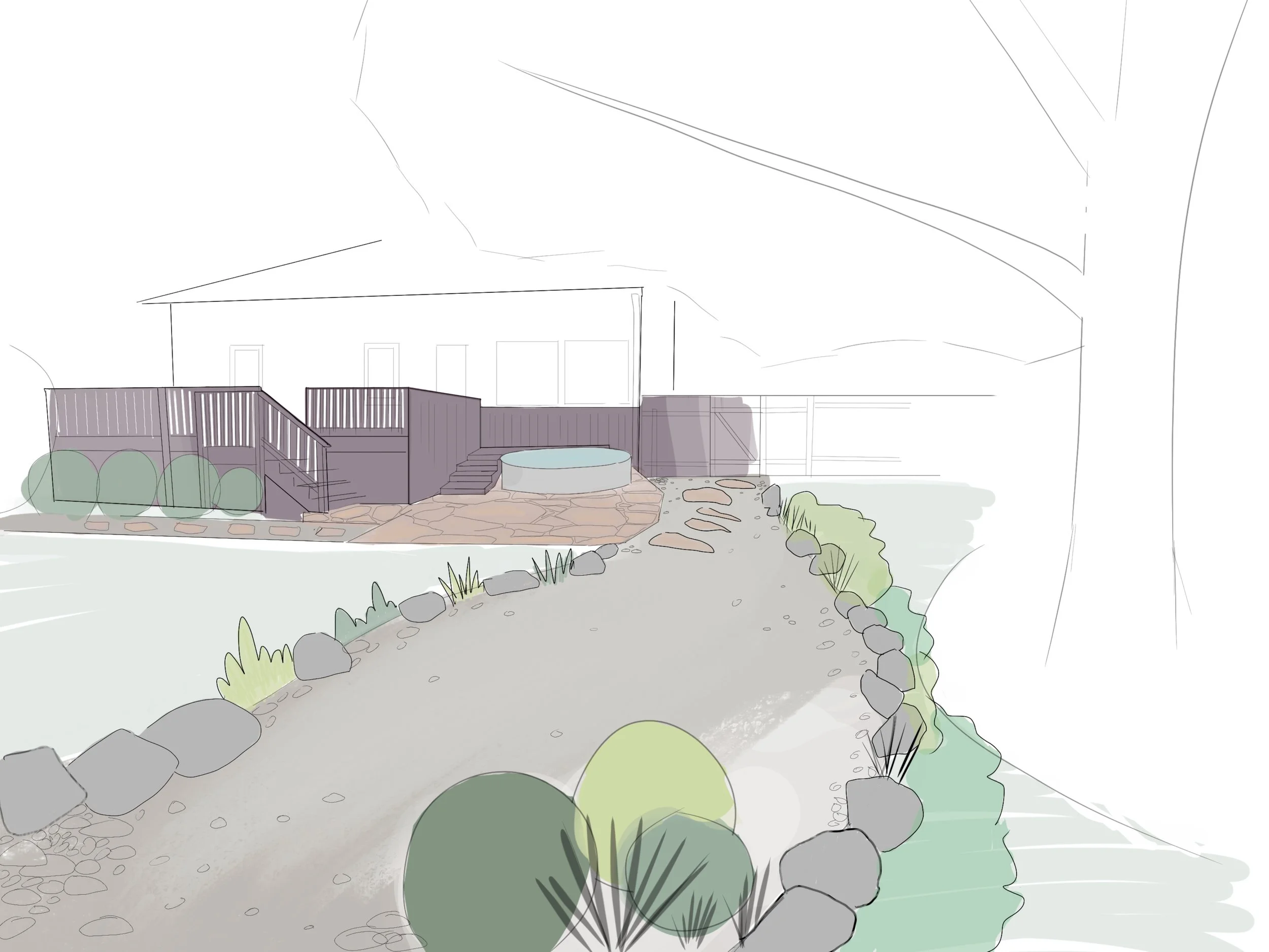 A patio, cowboy pool, and dog run liven up this shady yard, while a dry creek and rain garden provide focal points and a functional solution to erosion.