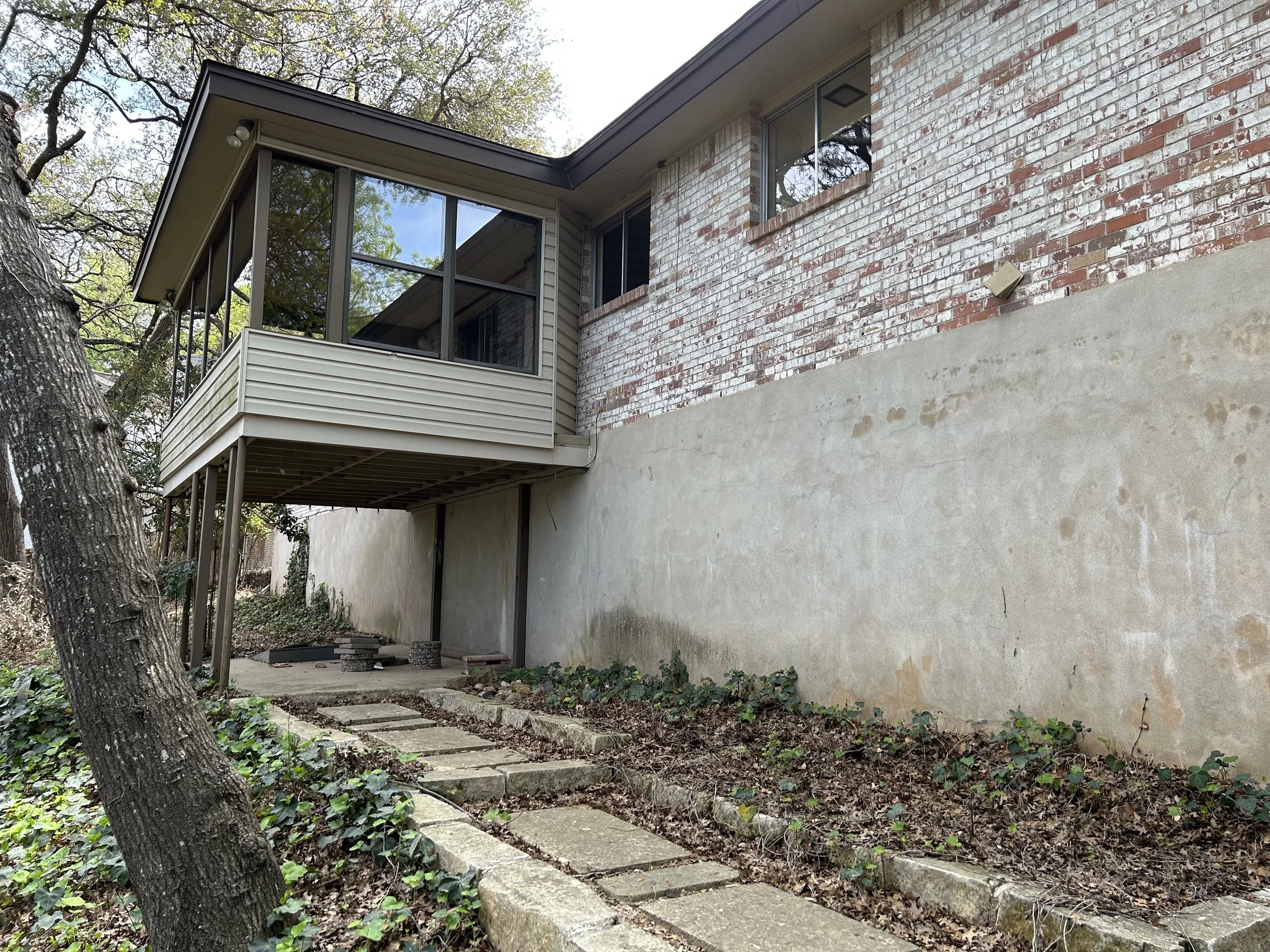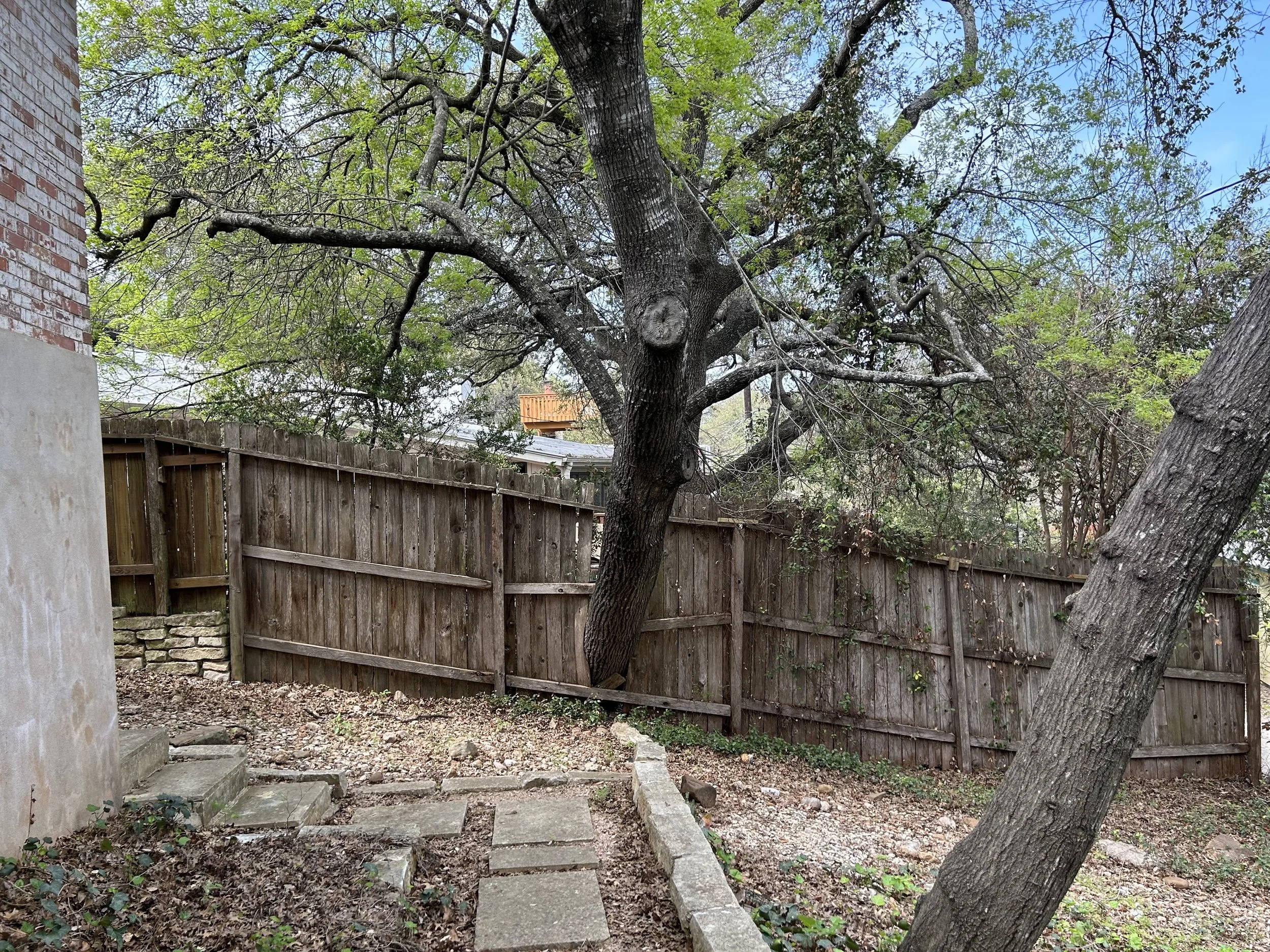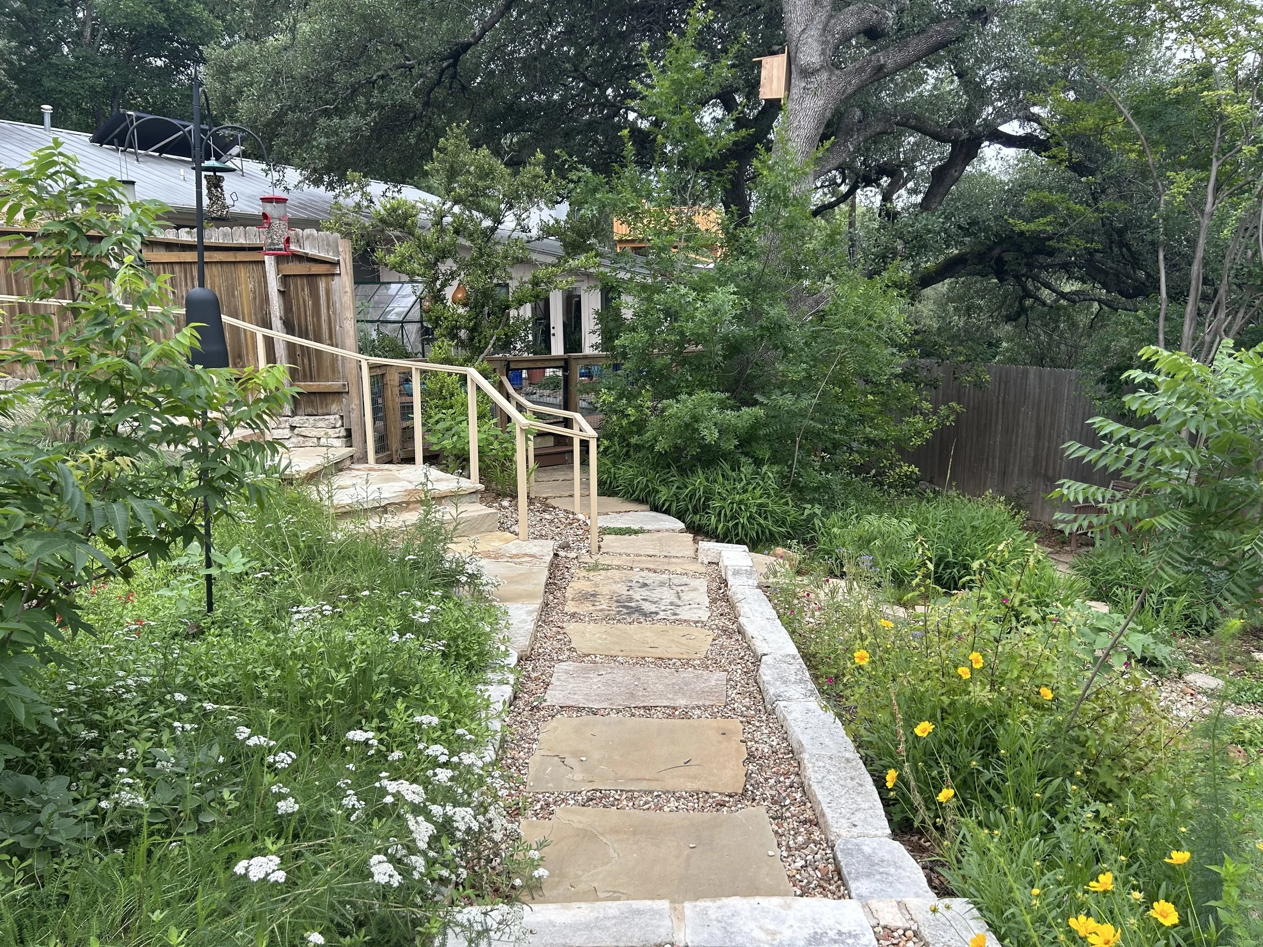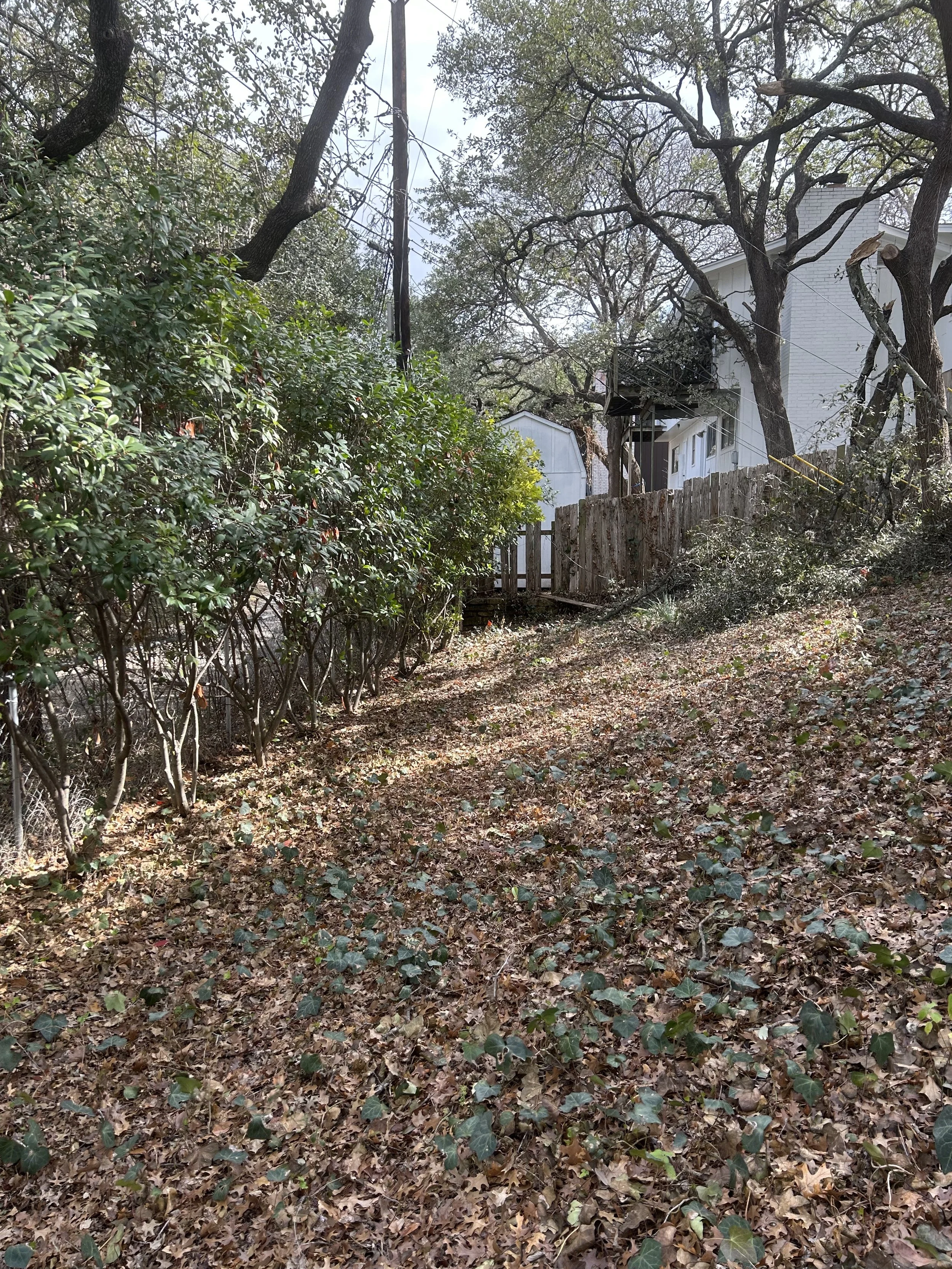 Before the demolition of the house, this steep and deeply shaded backyard was filled with invasive, non-native English ivy, Asian jasmine, and Photinia. We removed these plants, installed a screen of Alphonse Karr bamboo (a clumping, non-invasive variety), and planted wildflower seeds and planted several native trees and shrubs, such as toothache tree, elbow bush, and Carolina buckthorn. Many native species of plants volunteered, including yellow passion vine, American germander, Drummond aster, yaupons, and oaks.