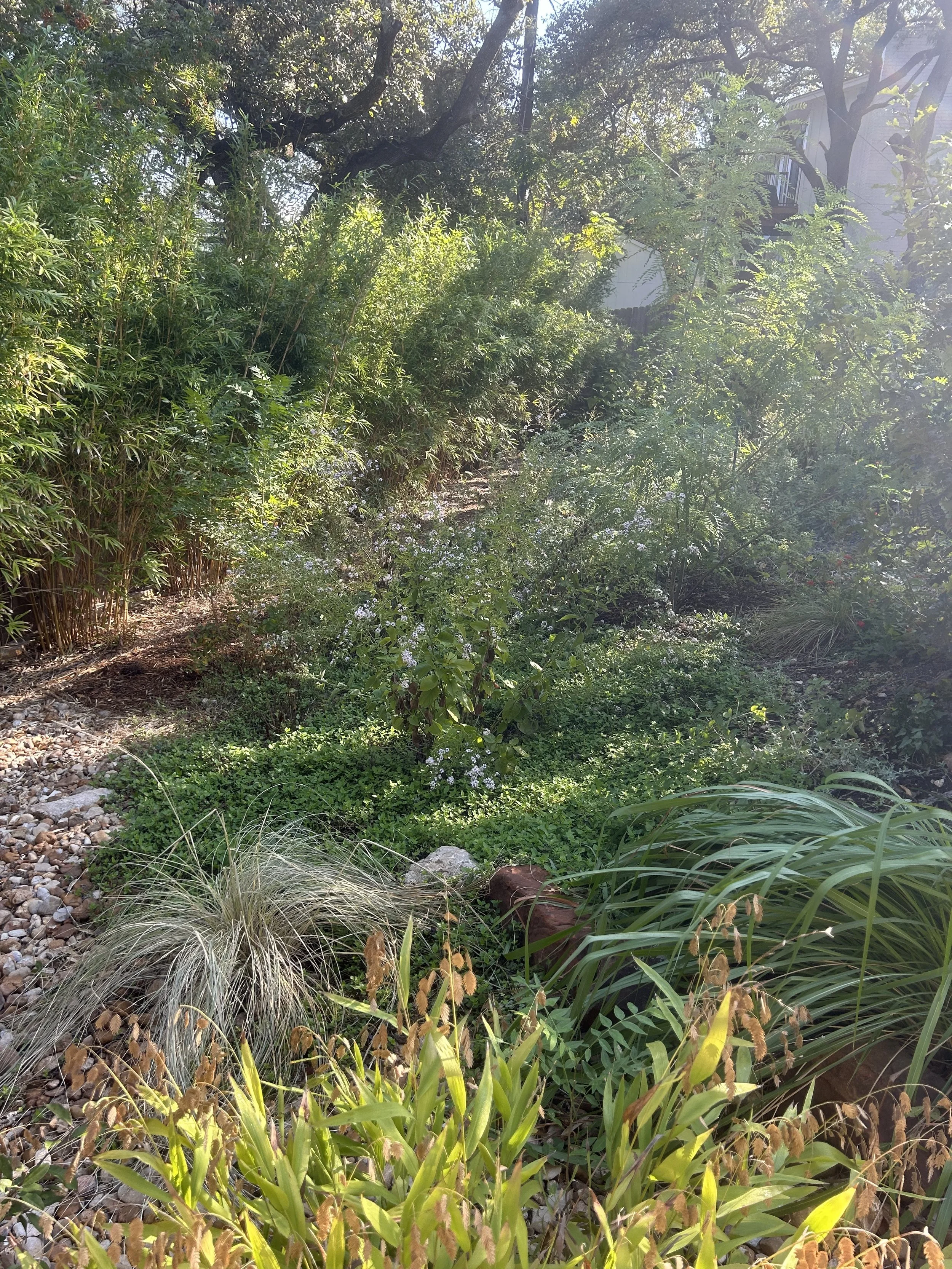 November 2025: A hedge of clumping Alphonse Karr bamboo provides privacy. We installed many species of native trees, perennials, and grasses, and let other plants volunteer.
